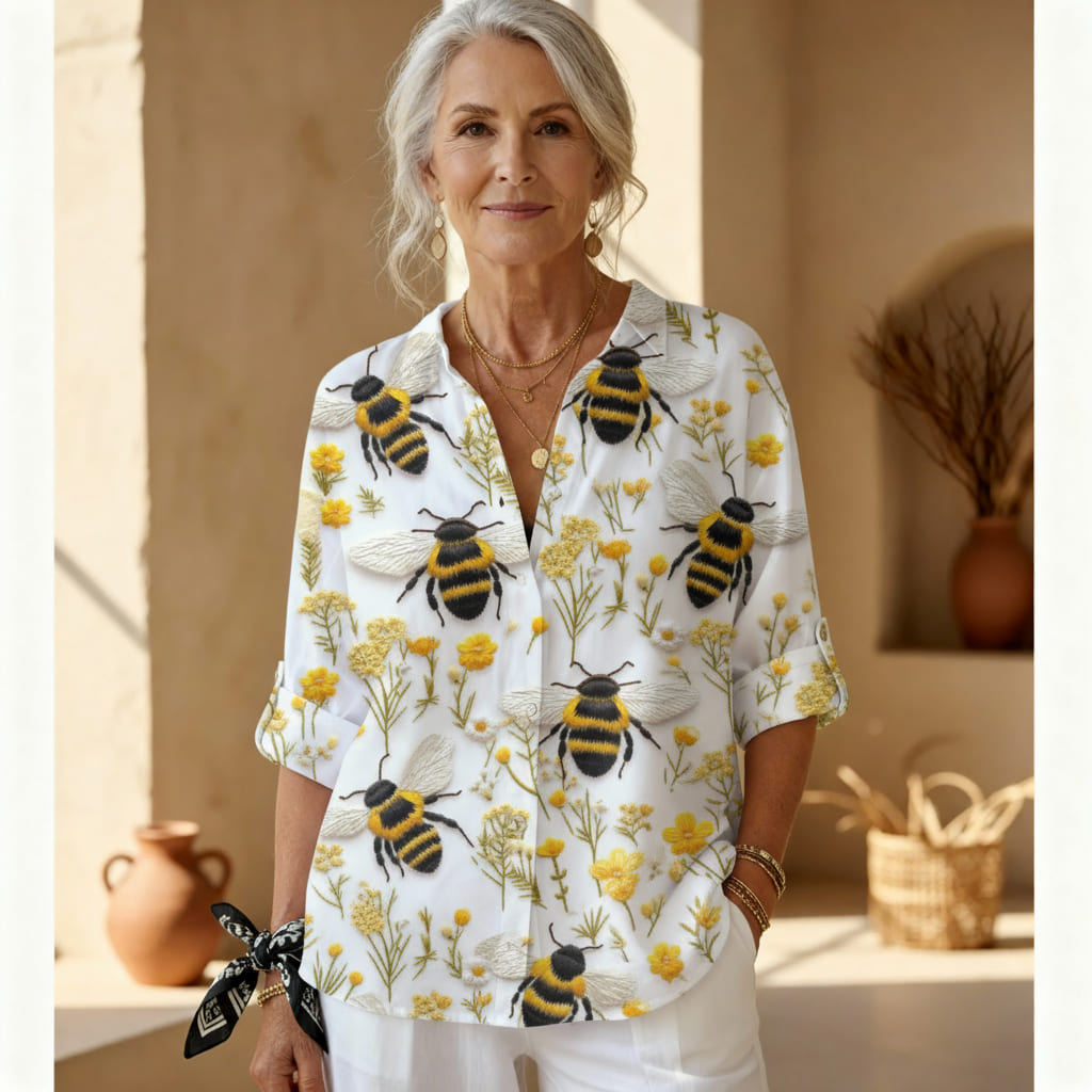 פיורין - חולצת דבורה זהובה מציעה עיצוב מקסים של דבורי דבש ופרחים צהובים עדינים על רקע לבן רענן. חולצה זו תופסת את יופיו של הטבע ומביאה נגיעה שמחה לארון הבגדים שלך — מושלמת לימים מזדמנים, מפגשי גן או פשוט לאמץ מצב רוח שמשי.